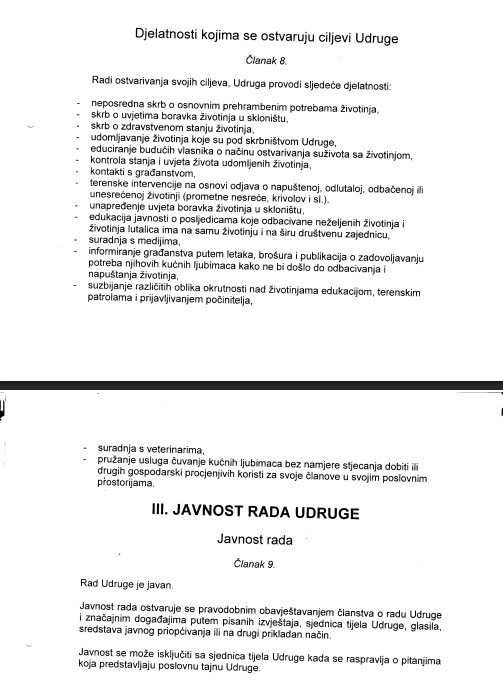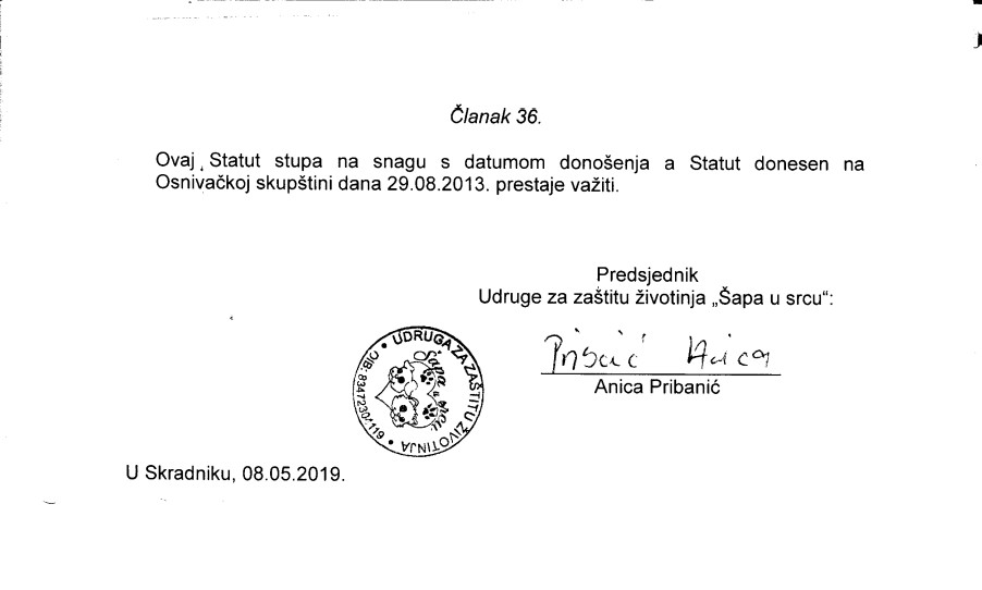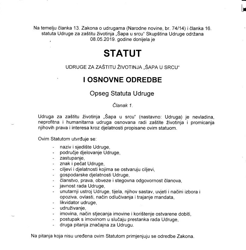 Bitni dijelovi statuta udruge Šapa u srcu: