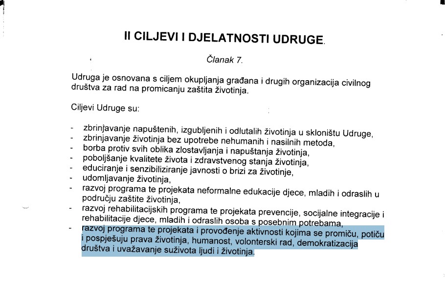 Uvidom u njihov statut, među ciljevima se navodi: “promicanje, poticanje i pospješivanje prava životinja, humanosti, volonterskog rada, demokratizacije društva i uvažavanja suživota ljudi i životinja.” Jasno, riječ je o plemenitim namjerama. No, stvarnost koju ta udruga projicira na društvenim mrežama i kroz javnu komunikaciju pokazuje posve suprotan obrazac ponašanja.