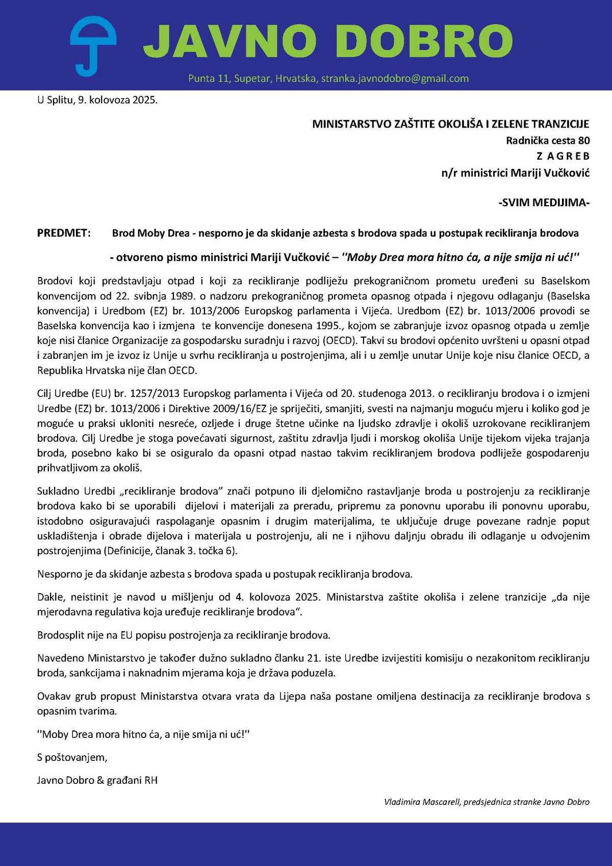 Stranka Javno Dobro i građani RH uputili su ministrici zaštite okoliša i zelene tranzicije, Mariji Vučković, otvoreno pismo u kojem upozoravaju na, kako tvrde, ozbiljan propust u slučaju broda Moby Drea, koji se nalazi u Hrvatskoj, a sadrži azbestne ploče.