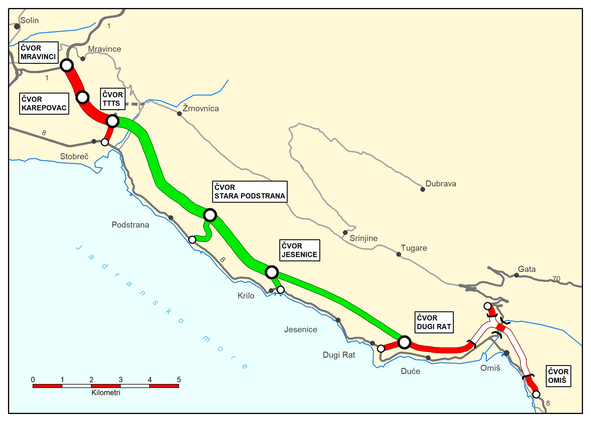 Jedan od ključnih dijelova ovog projekta je dionica brze ceste između Dugog Rata i Omiša, duga oko 4,5 kilometara. Za ovu dionicu, Hrvatske ceste su odabrale izvođača radova – hrvatsko-turski konzorcij Texo Molior i Özgün İnşaat. Vrijednost ugovora iznosi 84,7 milijuna eura bez PDV-a, što znači da je cijena izgradnje ove dionice približno 23,53 milijuna eura po kilometru.