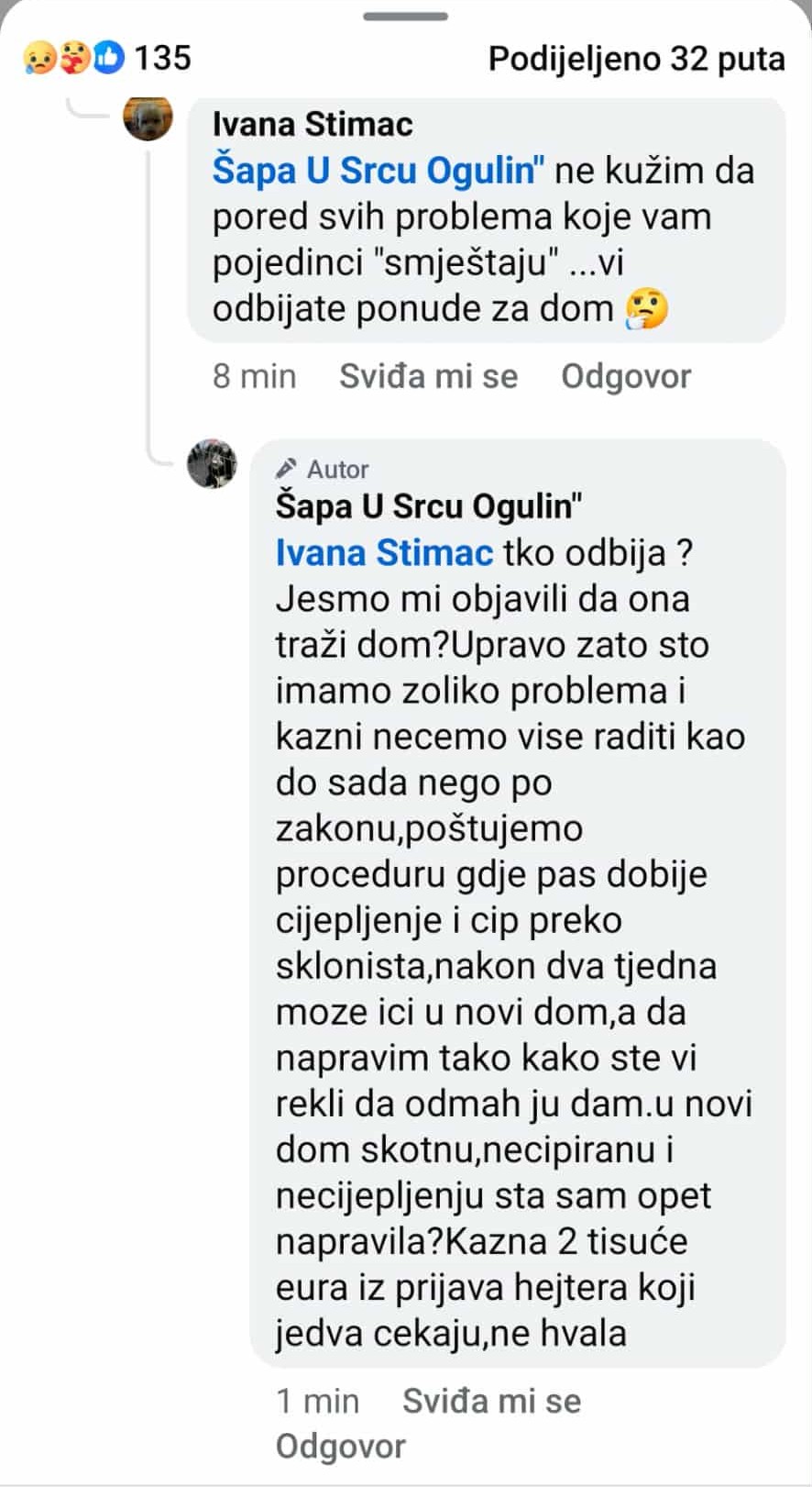 Dakle, dok su donacije bile namijenjene nesretnim psima – koje hrani kruhom i time se javno hvali, Pribanić je bez zakonskog okvira provodila vlastitu kampanju kontrole, pritisaka i osvete. U to je uključila i dobronamjerne udomitelje, kriveći ih za sudbinu bolesnog psa samo da bi preusmjerila pozornost s vlastitih odluka. A kad je riječ o novinaru koji je sve razotkrio – njega je, naravno, proglasila neprijateljem javnog interesa i “ubojicom pasa”.
