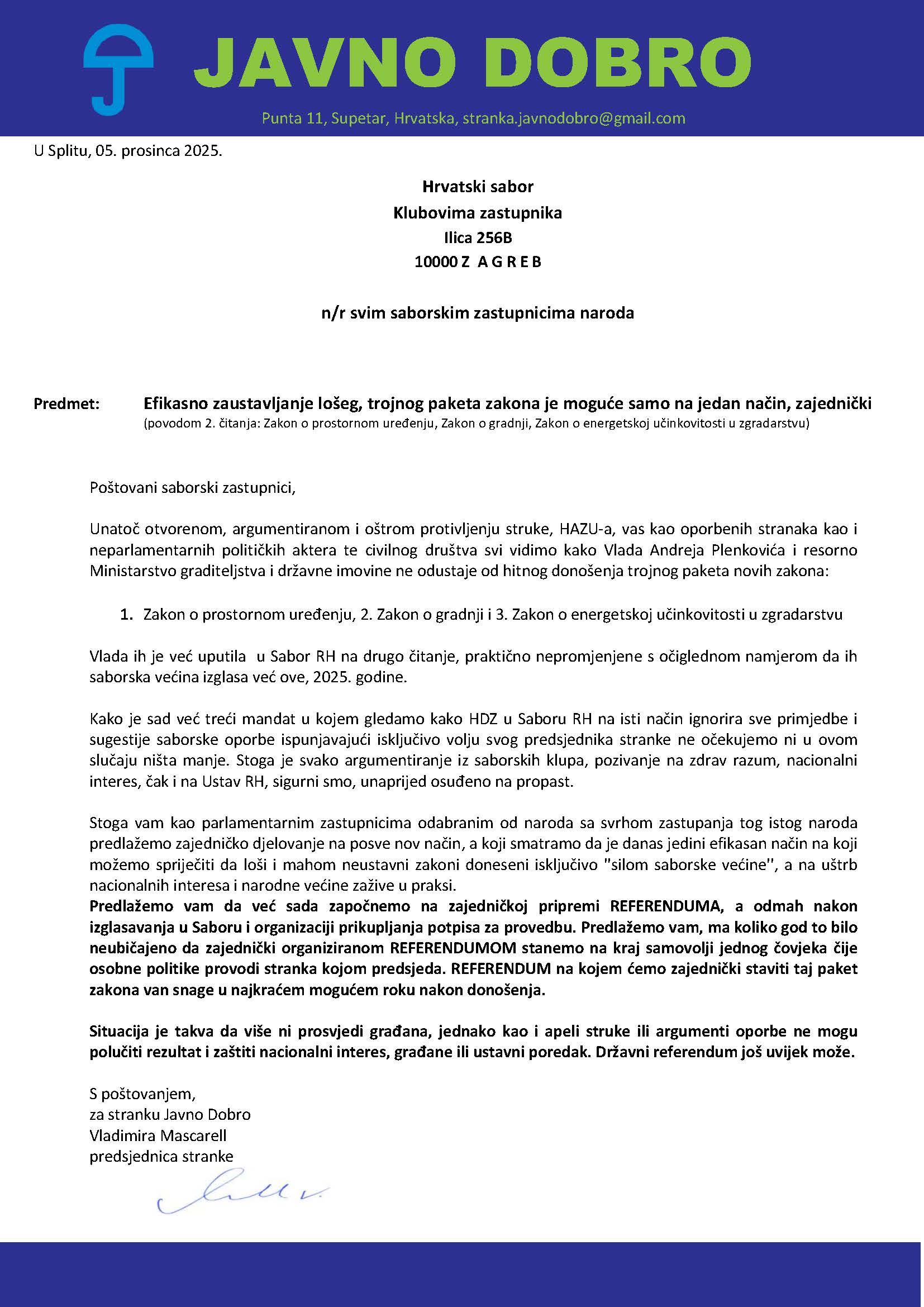 Stranka Javno Dobro uputila je svim saborskim zastupnicima oporbenih klubova pismo u kojem poziva na zajedničko djelovanje s ciljem blokiranja donošenja novog paketa zakona o prostornom uređenju, gradnji i energetskoj učinkovitosti u zgradarstvu. Riječ je o zakonima koji se nalaze u drugom čitanju i koje, prema procjeni stranke, vladajuća većina planira izglasati do kraja 2025. godine.