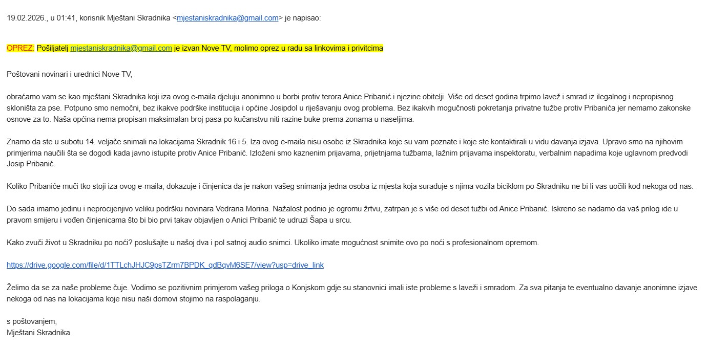 “Javljam vam se zbog nepodnošljivog laveža i smrada s kojim danonoćno živimo. U našem se mjestu nalazi jedno od neprijavljenih skloništa, koja unatoč brojnim inspekcijama, nitko ništa ne poduzima. Molimo vas da dođete i istražite jer mi nismo jedino mjesto s tim problemima”, poruka je gospodina Tuteka objavljena u uvodu priloga o hordericama Tihani Maretić Klarić iz Desnog Degoja i Anici Pribanić iz Skradnika.