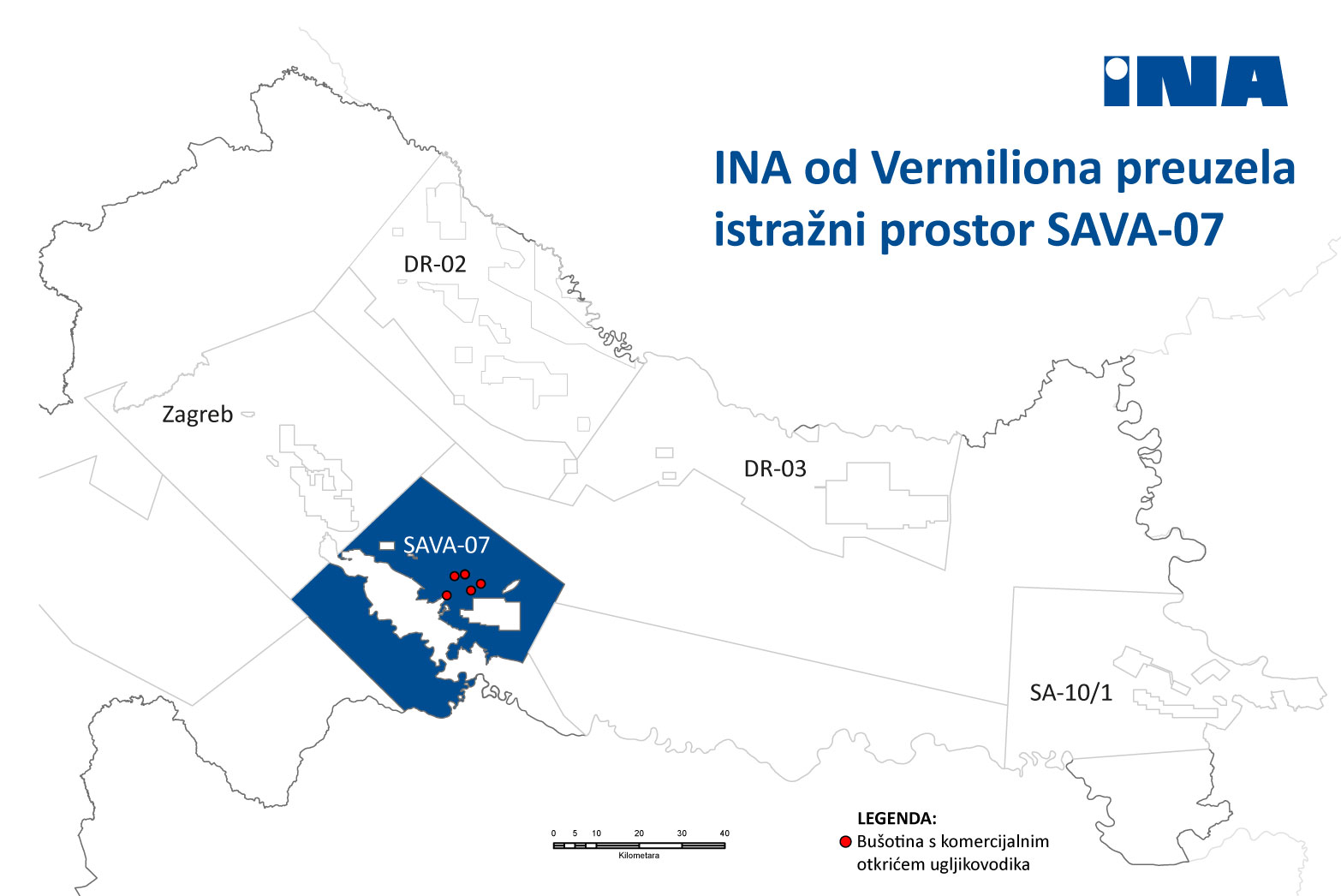 INA d.d. je s tvrtkom Vermilion Zagreb Exploration d.o.o. (Vermilion) potpisala obvezujući sporazum o preuzimanju 60 posto udjela na kopnenom istražnom prostoru SAVA-07, čime će INA postati nositelj 100-postotnog udjela na tom prostoru.